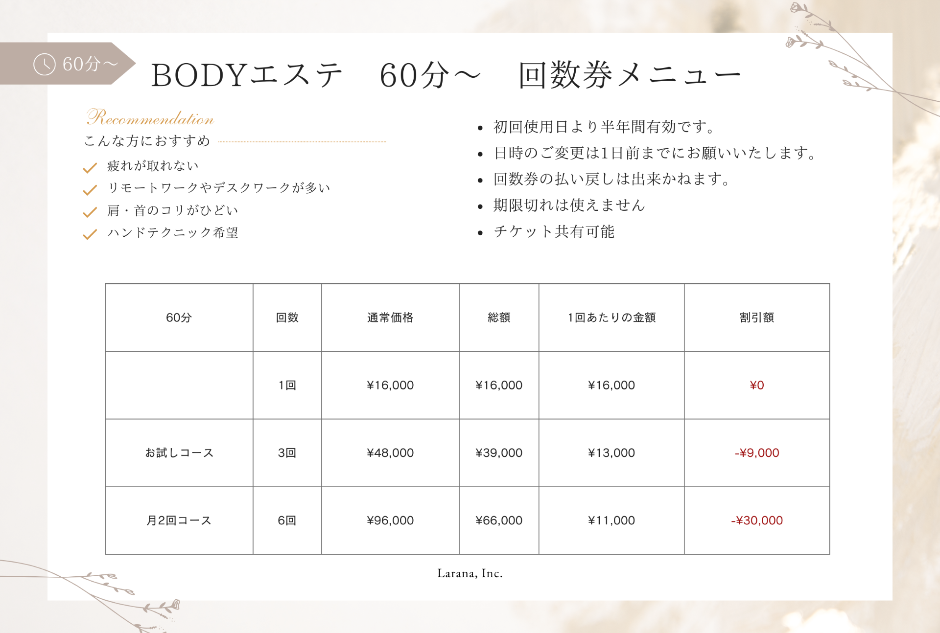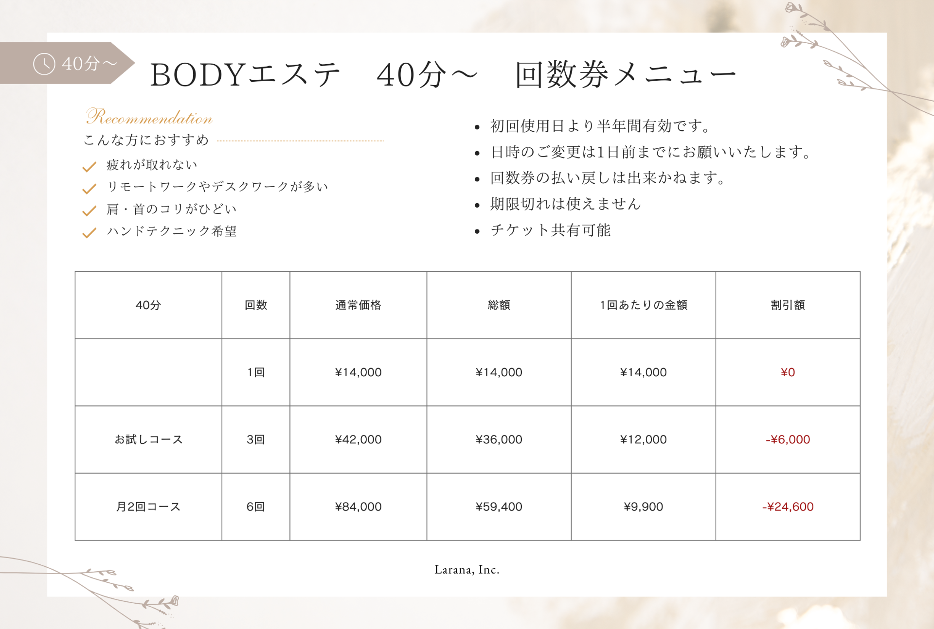 40分~120分まで、お好みや目的に合わせたコースをご用意。 ゆったりとした空間で、日常を忘れるような贅沢な時間をご堪能ください。
